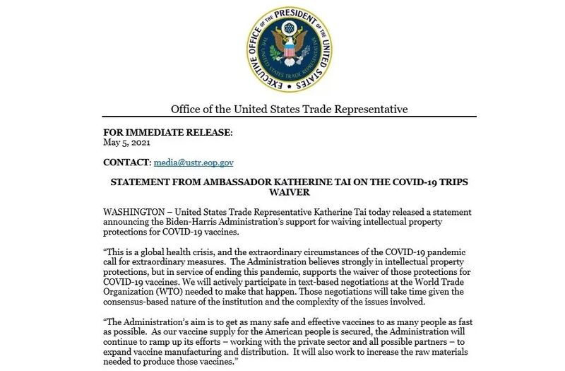 或是压力使然,美国贸易部部长戴琪发布声明称,放弃新冠肺炎疫苗的知识产权专利,旨在尽快普及安全有效的疫苗,尽早结束新冠疫情。