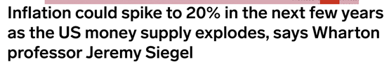 文|独静最近,美国通货膨胀似乎成为了网络上的一个热门话题。《商业内幕》近日报道,沃顿商学院、知名的经济学家教授Jeremy Siegel认为,美国的通货膨胀率将在未来两三年之内突破20%,相当于上世纪70年代美国的恶性通胀的情景。