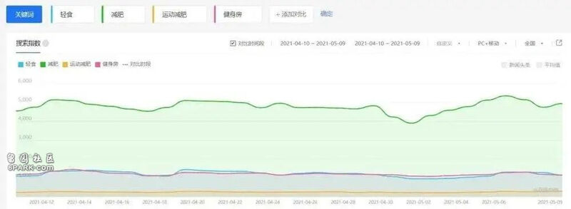 在百度指数搜索:减肥、轻食、健身房、运动减肥,可以看到,轻食和健身房的热度几乎为“减肥”的四分之一到五分之一。换言之,轻食已经成为了减肥健身行业必不可少的一部分。