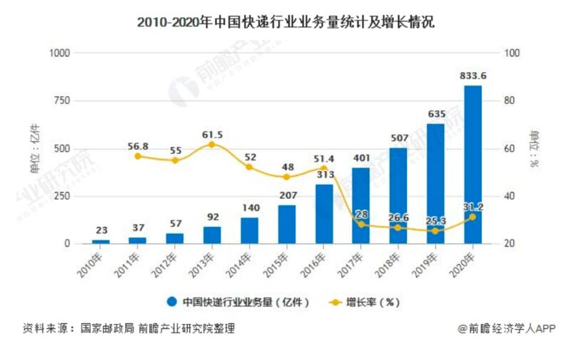 中国快递行业业务量逐年走高,前瞻产业研究院