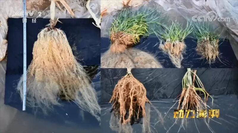 原来,经过新材料的改造,沙漠的上层虽然已经土壤化了,但底层土壤保持了沙子松散、透气的特征,农作物根系因此超常发展,发达的根系因此成就了高产的奇迹。