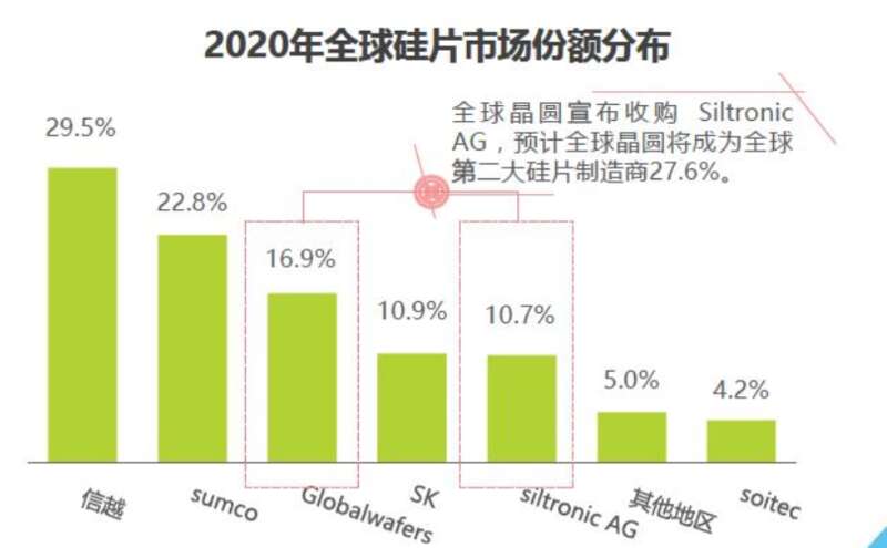 从全球市场来看,目前世界前五大半导体硅片厂分别为日本信越化工、日本Sumco、德国Siltronic、中国台湾环球晶圆与韩国LG Siltron,这5大厂商的市场份额高达90%+。