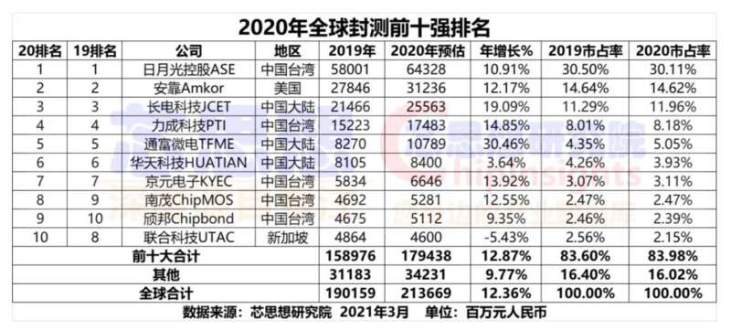 根据芯思想研究院(ChipInsights)的统计数据,2020年全球前十的封测公司中,中国大陆有三家(长电科技JCET、通富微电TFMC、华天科技HUATIAN)上榜,总市占率为20.94%,位列全球第二。