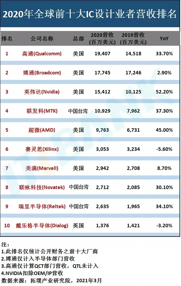但在营收和市场份额上,和世界先进水平相比仍有差距。知名机构TrendFerce公布的数据显示,2020年全球前十大营收芯片设计公司中,并未有中国大陆企业的身影。