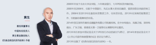 公开资料显示,黄生毕业于北京大学法学院,拥有多年金融行业从业经验。在喜投网网站上,他拥有四个头衔,分别是“喜投网董事长”“中国知名投资人”“黄生看金融创始人”和《钓鱼岛背后的货币战争》作者。