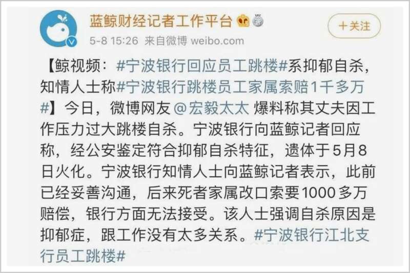 当月,财经网报道,宁波银行萧山支行一客户经理跳楼,这是2020年宁波银行第二个跳楼的员工。