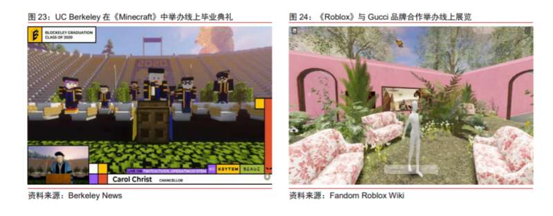 例如美国著名说唱歌手 Travis Scott 和 Lil Nas X 分别在 Fortnite 和 Roblox 举行虚拟演唱会;UC Berkeley等高校在 Minecraft 中举办毕业典礼;通过《动物森友会》也可以召开 AI 学术会议。