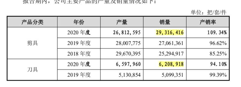 招股书显示,张小泉2020年剪具销量为2932万把,刀具为621万把,刀剪套装172万件,合计3725万件,相当于每天卖出10万多件刀剪产品。