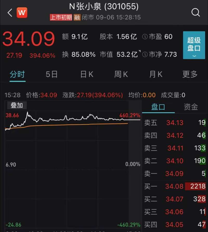 早盘时,张小泉的股价最高触及38.66元,涨幅约460%。截至收盘,股价有所回落,但涨幅仍高达394.1%,报价34.09元,最新市值为53.18亿元。