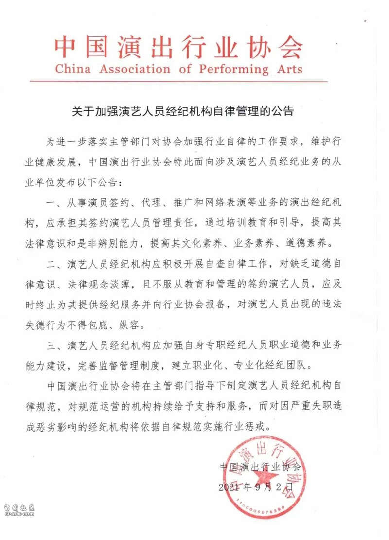 该媒体引述中国演出行业协会秘书长潘燕表示,从行业自律的角度来说,须尽量避免违法、违规的情形出现,增强法律意识、合法合规经营是从业人员及相关经纪机构应有的共识。“设立工作室不再是一个可以逃避责任的洼地”。他强调,从范冰冰的逃税事件,到近日国家税务总局公布郑爽逃税案件的处理决定,罚款共计2.99亿元,接连透露相关部门严惩逃税行为的决心。