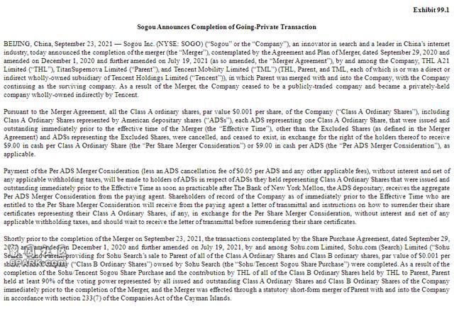 公告称,基于搜狗与THL A21 Limited (THL)、TitanSupernova Limited(母公司)、Tencent Mobility Limited (TML)于2020年9月29日签署的合并协议和计划、2020年12月1日的修订、2021年7月19日进一步修订协议及其项下与之相关的协议,母公司将与搜狗合并,搜狗将作为存续公司继续运营。合并完成后,搜狗将成为腾讯控股间接全资子公司,并完成退市。
