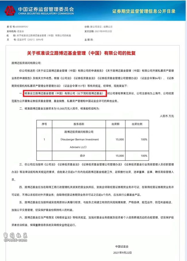 批复函显示,路博迈基金注册资本为1.5亿元人民币,由路博迈投资顾问有限公司(Neuberger Berman Investment Advisers LLC)100%控股,注册地为上海市,公司经营范围为公开募集证券投资基金管理、基金销售、私募资产管理和中国证监会许可的其他业务。