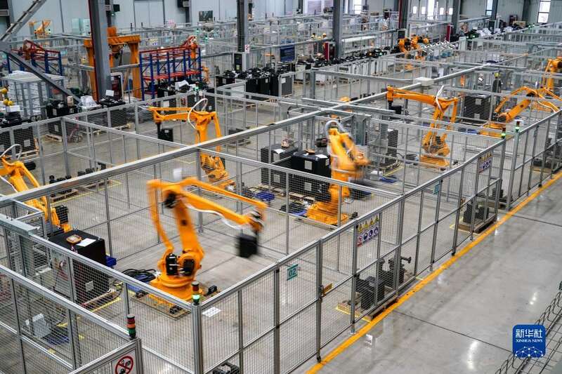 7月1日,在位于江苏省南京市江宁区的南京埃斯顿自动化股份有限公司工业机器人生产车间,工业机器人在进行跑合测试。新华社记者 李博 摄