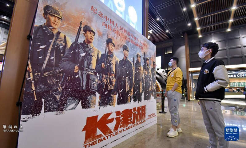 10月7日,两名年轻人在北京一家影院观看电影《长津湖》的海报。新华社记者 李欣 摄