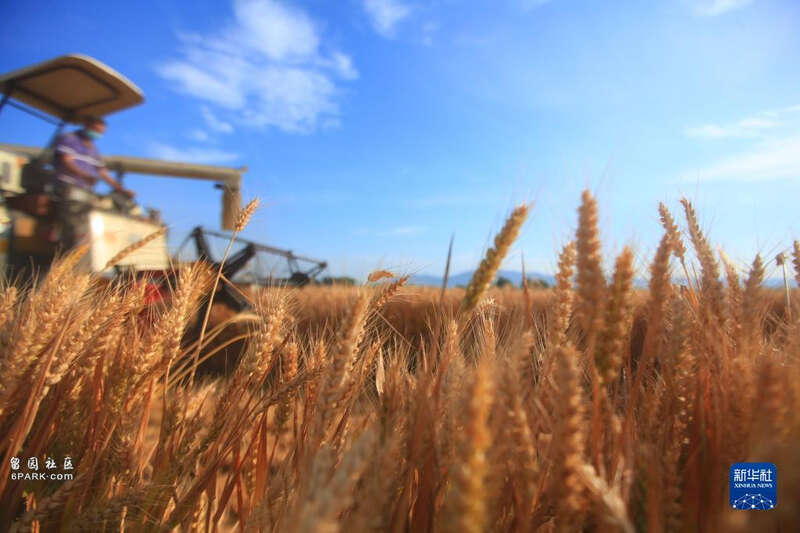 6月8日,收割机在山东省临沂市平邑县的麦田里收割小麦。新华社发(武纪全 摄)