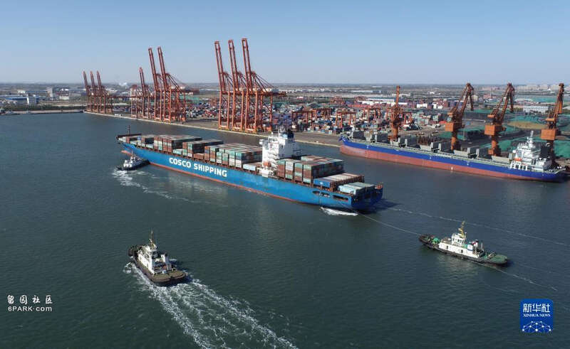 10月23日,一艘轮船向唐山港京唐港区集装箱码头靠泊(无人机照片)。新华社记者 朱旭东 摄