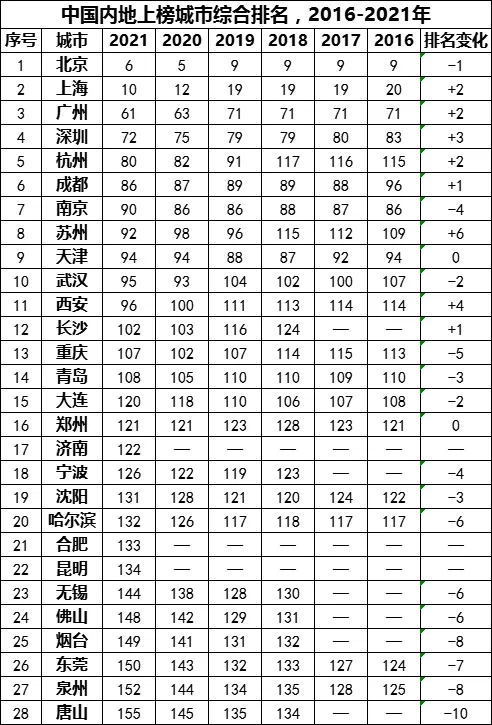 另据媒体统计,成都上升1位,位列全球第86;苏州上升6位,位列第92;天津排名保持第94名不变;西安上升4位,位列第96。