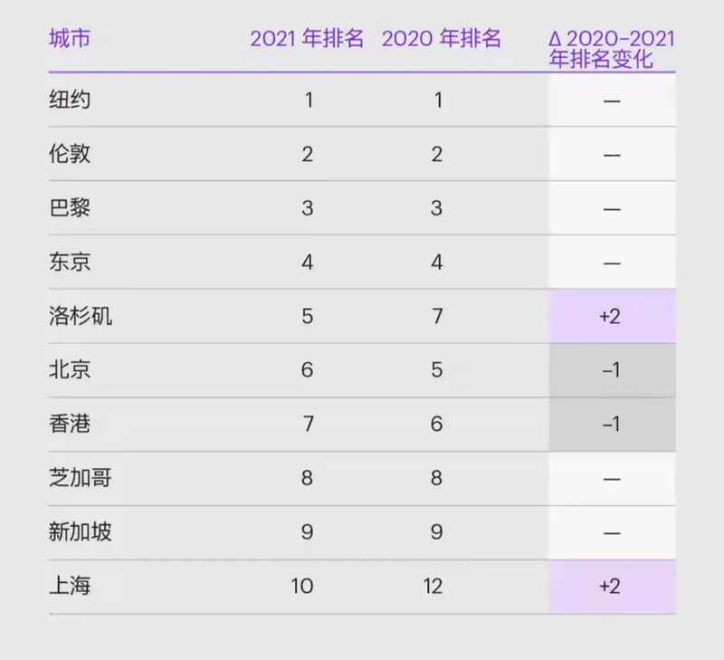 报告显示,纽约、伦敦、巴黎、东京继续位列全球TOP4城市,来自中国的北京、香港、上海也跻身全球前十。