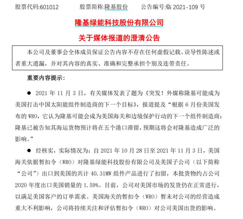 当天晚间,隆基股份公告称,自2021年10月28日至2021年11月3日,美国海关依据暂扣令(WRO)对隆基绿能科技股份有限公司及美国子公司出口到美国的共计40.31MW组件产品进行了扣留,本批货物约占公司2020年度出口美国销量的1.59%。目前,公司对美国市场的发货仍在正常进行,以满足美国客户的订单需求。美国海关的暂扣令(WRO)暂未对公司的经营造成重大不利影响,公司将持续关注和评估暂扣令(WRO)对公司美国出货的影响。