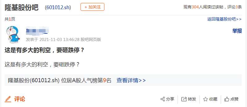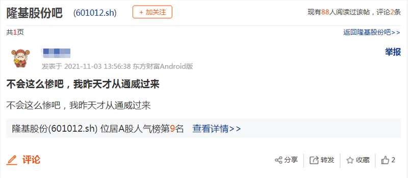 针对隆基股份暴跌,股吧网友彻底炸开了。有网友表示,“这是有多大的利空,要砸跌停?”,也有倒霉的网友碰上了,称“不会这么惨吧,我昨天才从通威过来”。