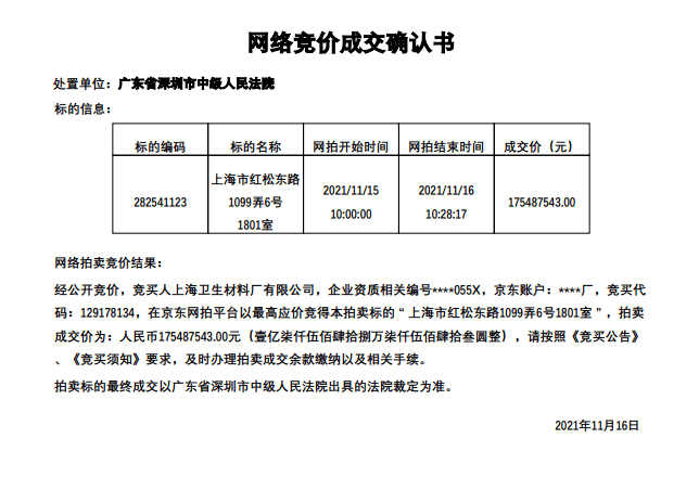 经评估,该房产评估值为1.02亿元。此次拍卖的起拍价为7153.75万元,加价幅度为35万元。此次拍卖,出价记录合计103次,最终,上海卫生材料以最高应价竞得该房产,成交价为1.75亿元。
