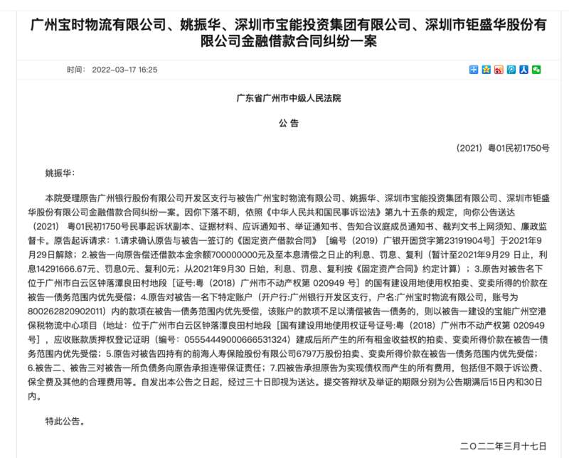 3月17日,广州市中级人民法院发布了《关于广州宝时物流有限公司、姚振华、深圳市宝能投资集团有限公司、深圳市钜盛华股份有限公司金融借款合同纠纷一案》的公告。
