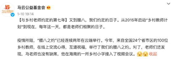 马云的微博认证依旧是乡村教师代言人。似乎只有身处教师队伍,他才能有难得的轻松。