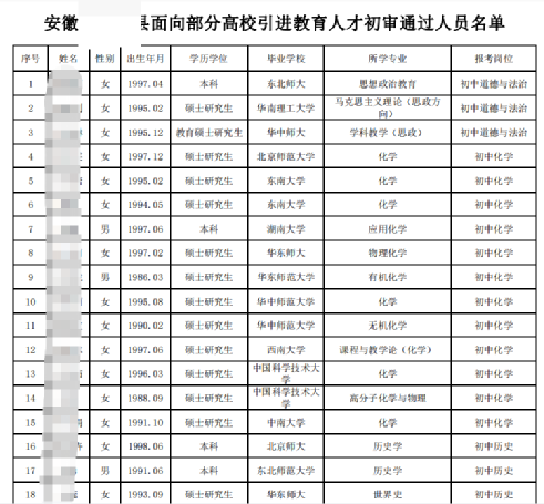 安徽F县,最近面向部分高校引进教育人才50名,结果初审通过人员名单有257名!竞争比5:1。