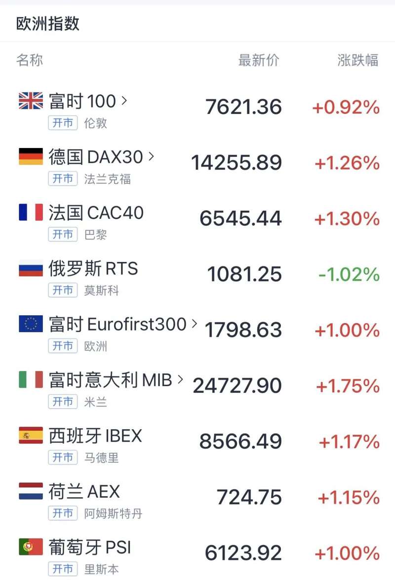 再来看看欧洲其他市场的情况。除了俄罗市场之外,其他市场纷纷上涨。英国富时100上涨近1%,德国、法国、意大利等均上涨超1%。