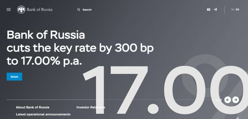 4月8日,俄罗斯央行将基准利率下调300个基点至17%。