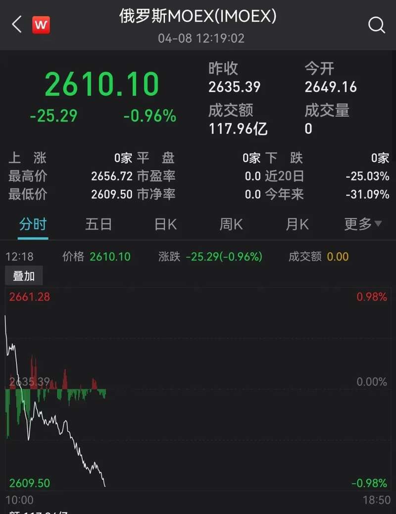 截至发稿,俄罗斯MOEX指数持续下跌,截至发稿已经下跌近1%。