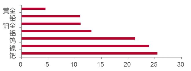 2021年,俄罗斯有色金属出口中,钯、镍及钨的出口量分别占全球出口总量的26%、24%及21%。铝、铂金和铅的出口占全球出口总量均超过10%。乌克兰是氖、氪及氙等稀有气体的主要供给国,而此类稀有气体是半导体光刻和蚀刻工艺的关键材料。乌克兰的稀有气体主要向美国、韩国等通信电子制造大国出口,美国超过90%的半导体级氖气来自于乌克兰。