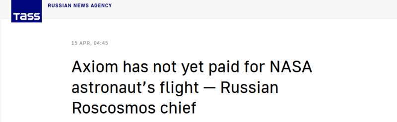 14日,俄罗斯国家航天公司总裁德米特里·罗戈津接受电视采访时透露,美国私营商业航天公司Axiom Space因为“后勤问题”还没能为美国NASA航天员马克·范德·黑的宇航飞行支付费用,但是该公司承诺将在2022年5月还清债务,“这是一大笔钱——20亿卢布(约合美元2420.5万)。”
