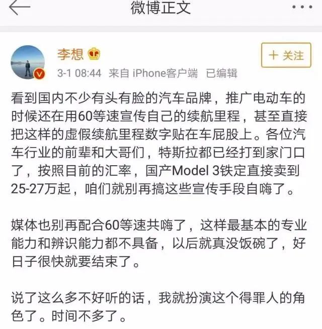 理想汽车创始人李想直接在微博号召国内车企要开始重视起来和特斯拉搞竞争了。