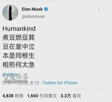 结果马斯克才不管自己是不是美资企业,直接在推特上发了首中文诗。