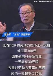 对此著名经济学家、三农问题专家温铁军曾帮助大家做过对比,“现在北京的劳动力市场上,普工一天是300元,如果他回村去做农业,一天能有30元吗?农业对劳动力要素的回报,恐怕一天不超过30元。”