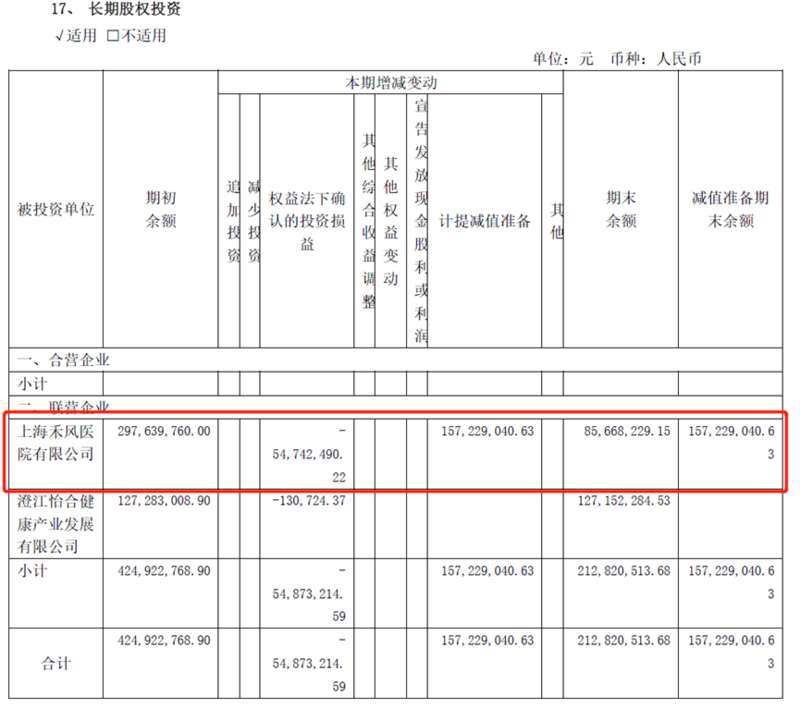 禾风医院计提大额减值准备