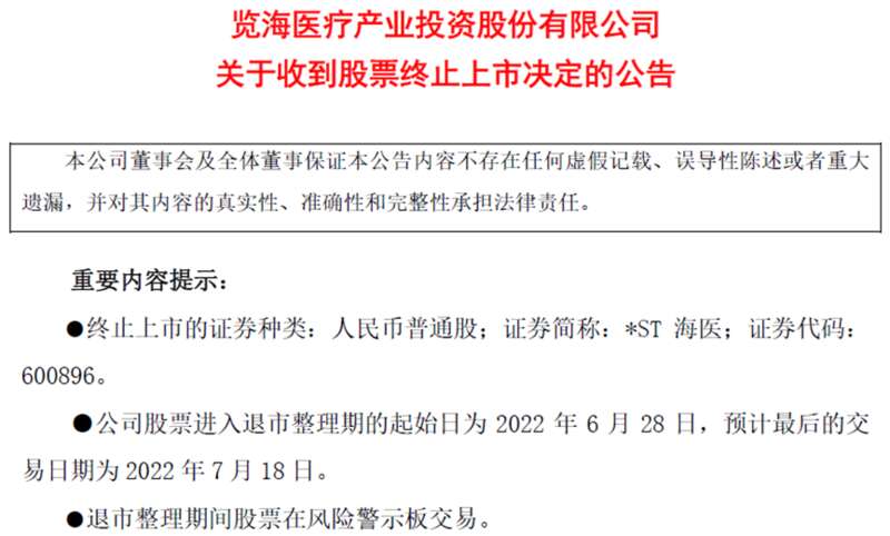 因2020年度扣非后归母净利润为负数,且营业收入在1亿元以下,览海医疗自2021年5月6日起被实施退市风险警示,7月18日成为最后一个交易日。