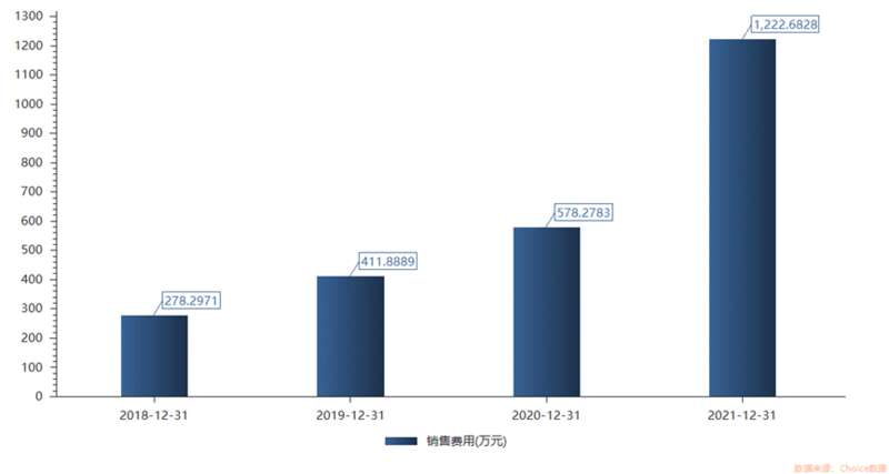 2018-2021年,览海医疗销售费用由278.3万大幅提高至1222.7万,翻了4.4倍,复合增长率为44.78%;