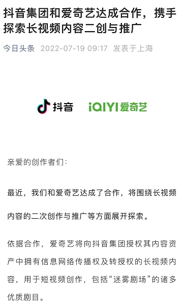 实际上不仅仅是爱奇艺跟抖音,半个月前,快手跟乐视也合作了。