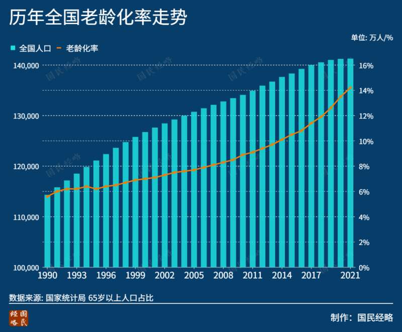 少子化只是问题的一方面,人口老龄化的压力同样迫在眉睫。2021年,全国65岁以上人口首次超过2亿人,占比达14.2%,首次突破深度老龄化门槛。