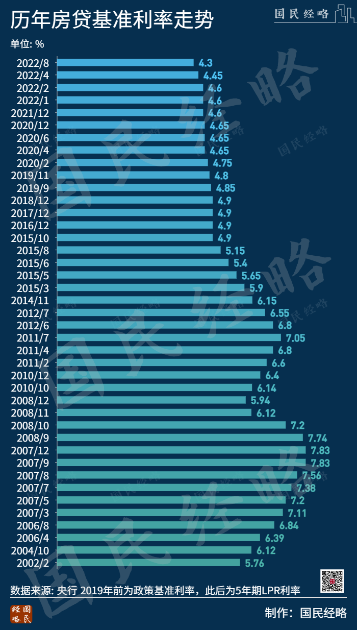 与之对比,2009年时我国房贷基准利率为5.95%,考虑到最低7折的打折因素,当时最低房贷利率仅为4.156%。