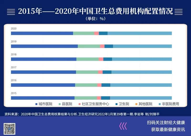 在新冠疫情前,卫生费用有向大医院倾斜的趋势。《2020年中国卫生总费用核算结果与分析》显示,2015年—2019年,中国城市医院和县医院费用占卫生总费用(机构法)比重,从53.43%上升到55.36%,其中流向城市医院的费用占比,从39.52%上升到41.55%。