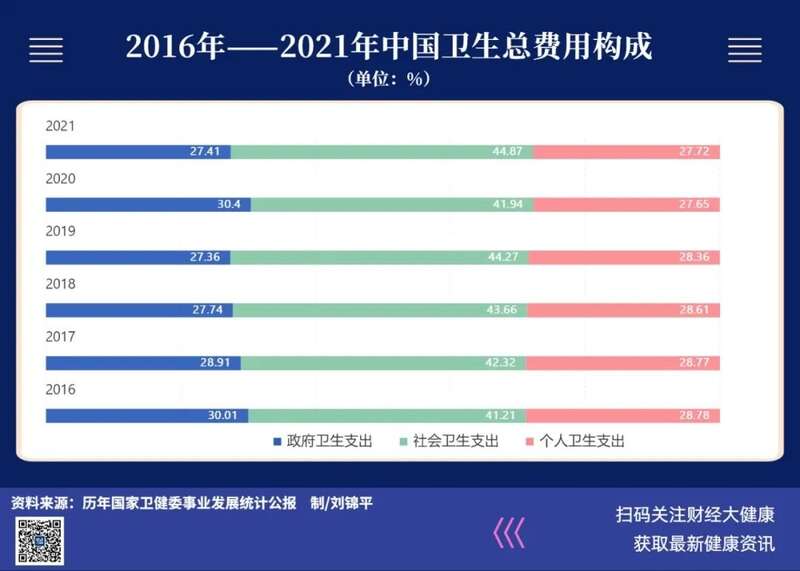 2020年中国卫生总费用在7.2万亿元,达到1978年以来的最高值。这笔钱,占国民生产总值(GDP)7.12%。其中,个人卫生支出占比为近30年来的最低水平。