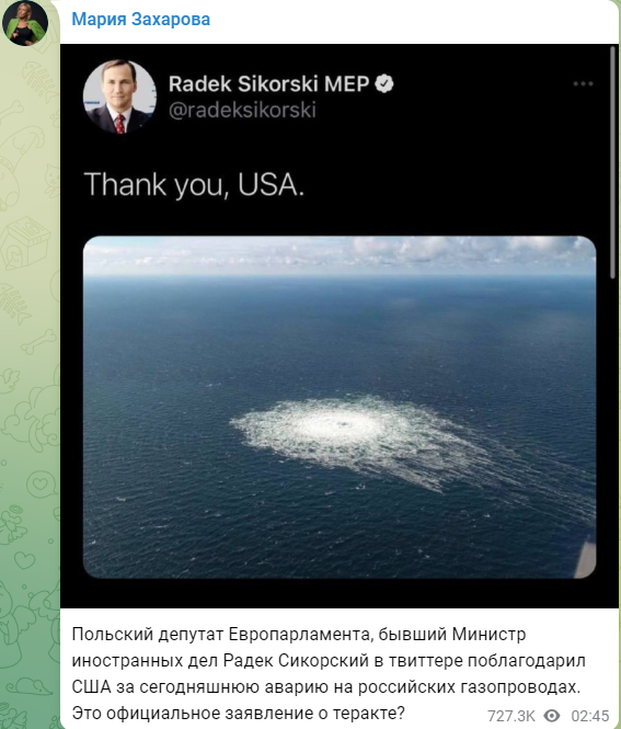 ▎ 据塔斯社等俄媒报道,西科尔斯基27日在推特上发了5则与“北溪”管道相关的帖子。在第五则帖子中,西科尔斯基直接发送了“北溪”管道发生事故的现场图,并配文称:“谢谢你,美国。”俄罗斯外交部发言人扎哈罗娃接着问道:“这是关于恐怖行为的正式声明吗?”