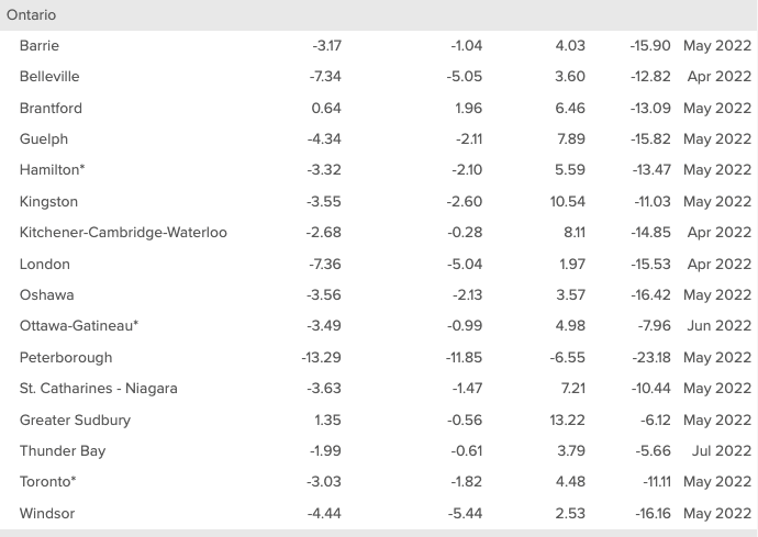 最大的月度降幅均在安省,其中排首位是彼得伯勒(Peterborough),房价指数月跌13.29%,经季节调整后月跌11.8%,与5月份的房价指数峰值相比,已经跌去23%。