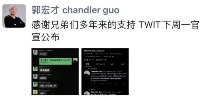上周五,一个名叫Chandler Guo的华人站出来表示:自己即将出任推特的新CEO。