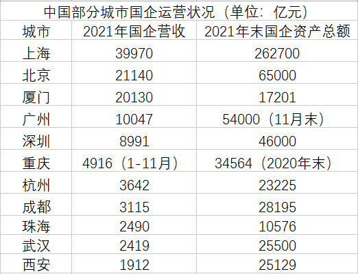 在这三家世界500强企业的加持下,厦门创造了一个奇迹:2021年市属企业的营业收入高达20130亿元,仅次于上海和北京,是广州和深圳的2倍多,是重庆的3倍多。
