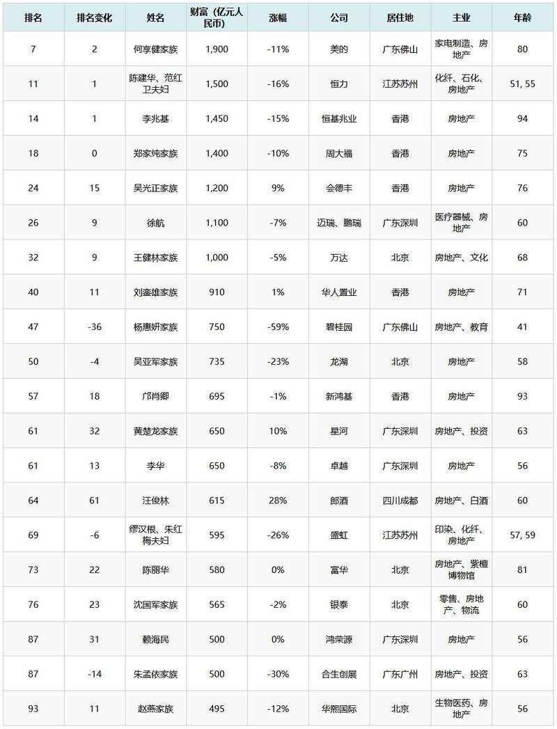 不过,杨惠妍家族依旧是住宅开发领域最大富豪,以750亿元个人财富位居榜单47名(较去年下降36个名次)。