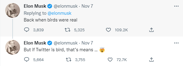 马斯克在评论区继续写道:那时候鸟还是真的,但如果推特是鸟,那意味着……
